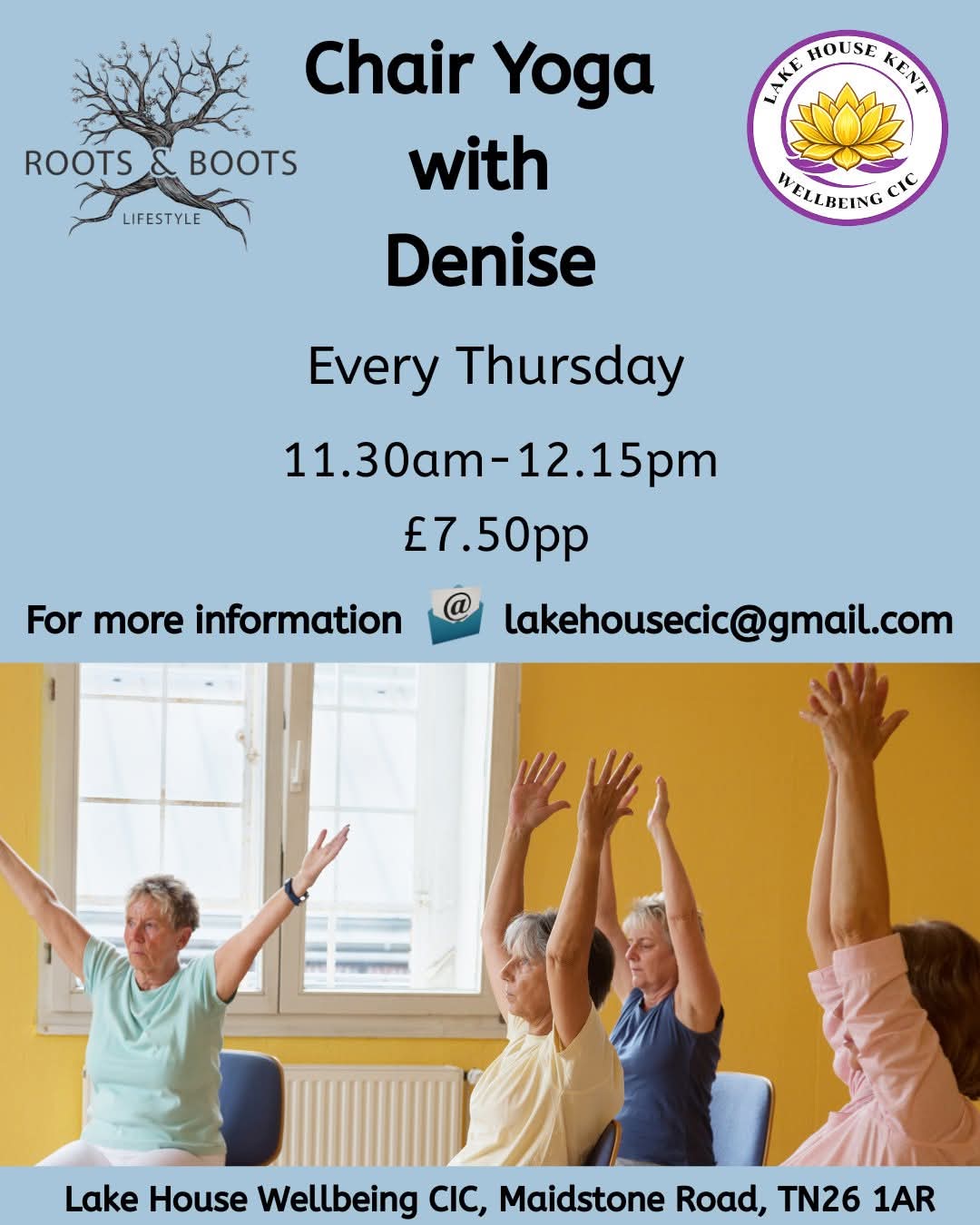 🌟Chair Yoga Classes @Lakehouse Kent Wellbeing CIC every Thursday from 11.30am -12.15pm.🌟 Come and join us for a class supporting mobility and building community £7.50Â