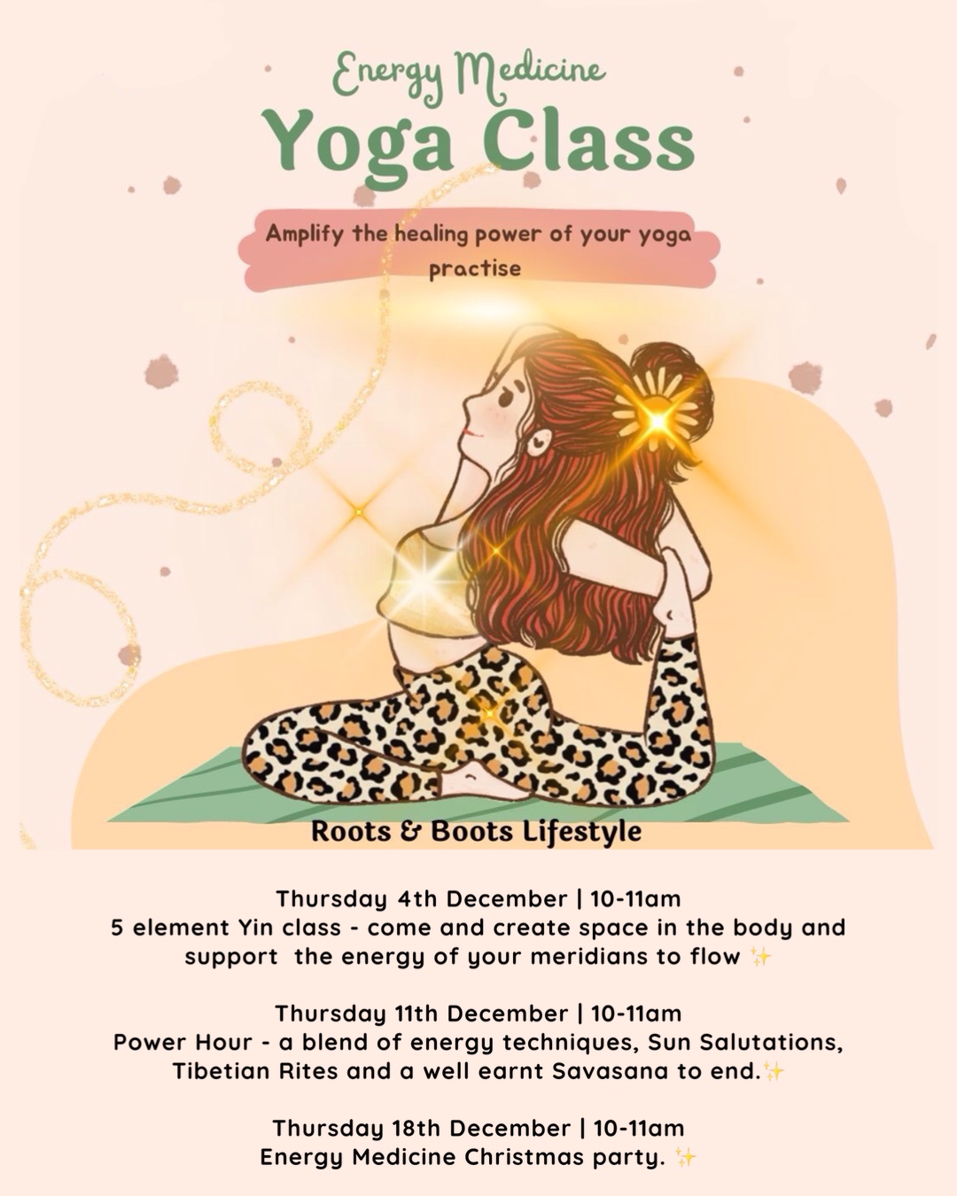 Thursday 11th 10-11am – Power Hour – a blend of energy techniques, Sun Salutations, Tibetian Rites and a well earnt Savasana to end.✨