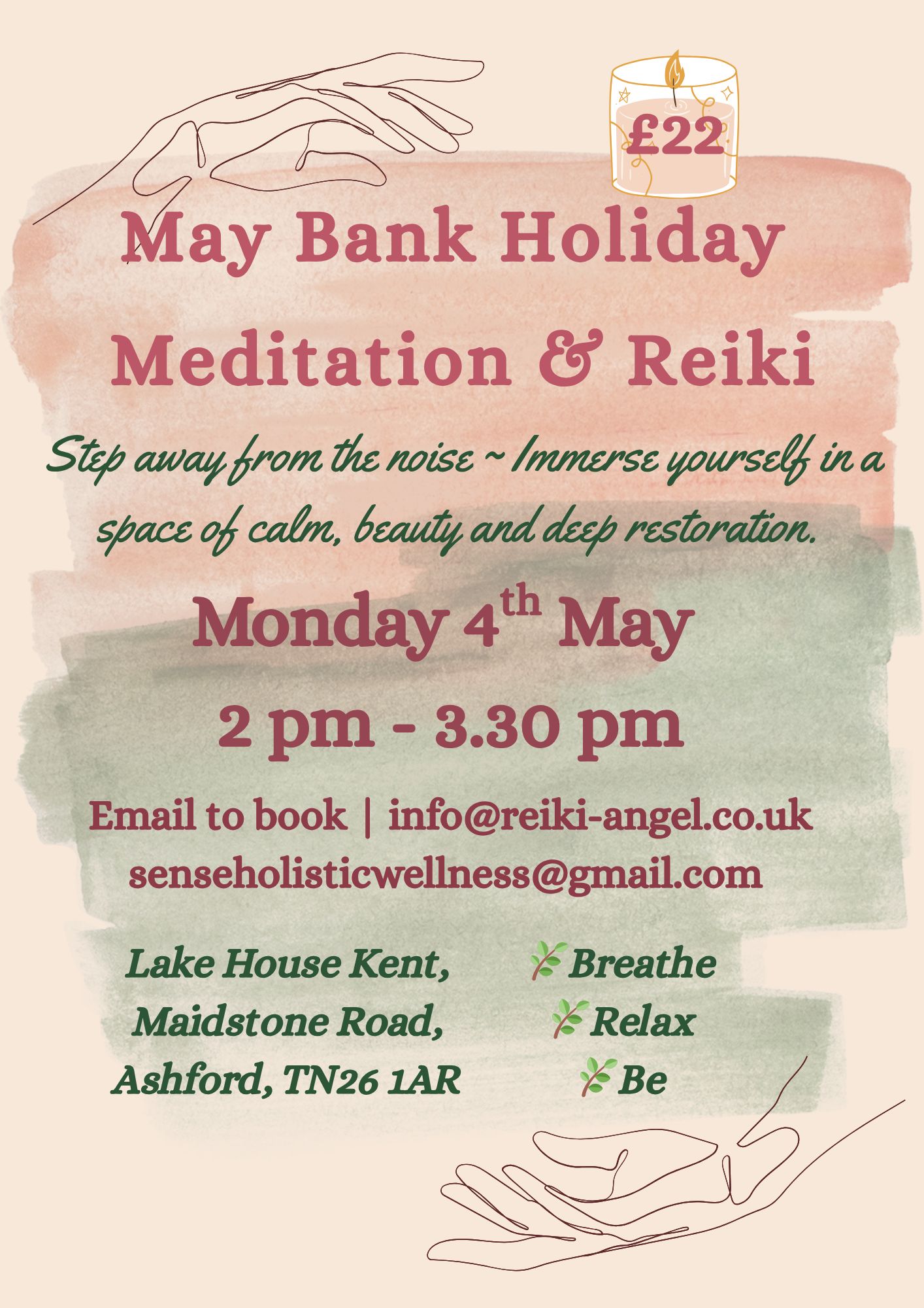 ✨ MAY BANK HOLIDAY ~ MEDITATION & REIKI | Monday 4th May | 2.00 – 3.30pm | LAKE HOUSE KENT | ASHFORD ✨