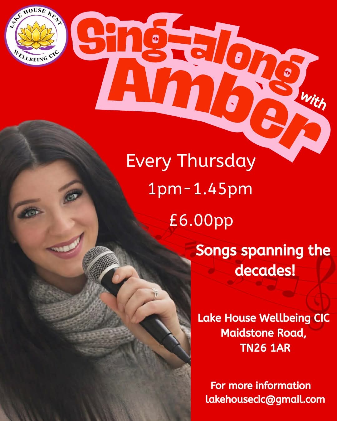Every Thursday 1pm – 1.45pm! £6.00 pp Songs Spanning the decades! Lake House Wellbeing CIC, Maidstone Road, TN26 1AR for more information: lakehousecic@gmail.com